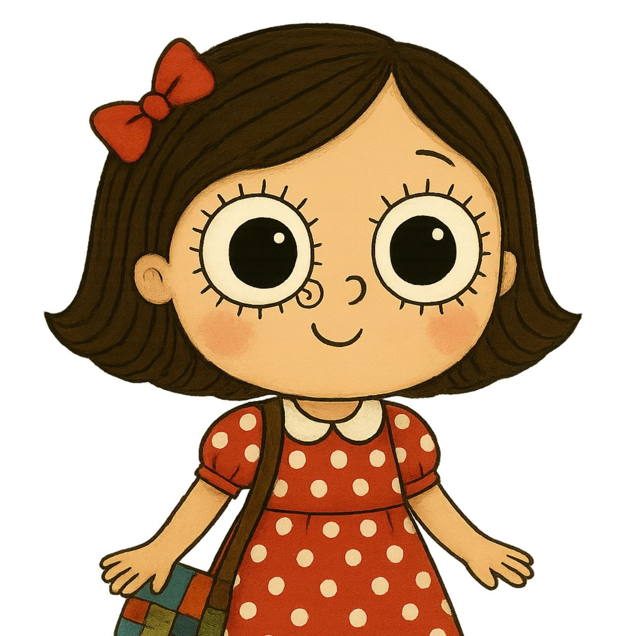 Uma garotinha sonhadora com olhos grandes e uma bolsinha mágica cheia de segredos. Em suas histórias poéticas, ela vive aventuras entre o real e o imaginário com sua amiga joaninha de botas vermelhas.