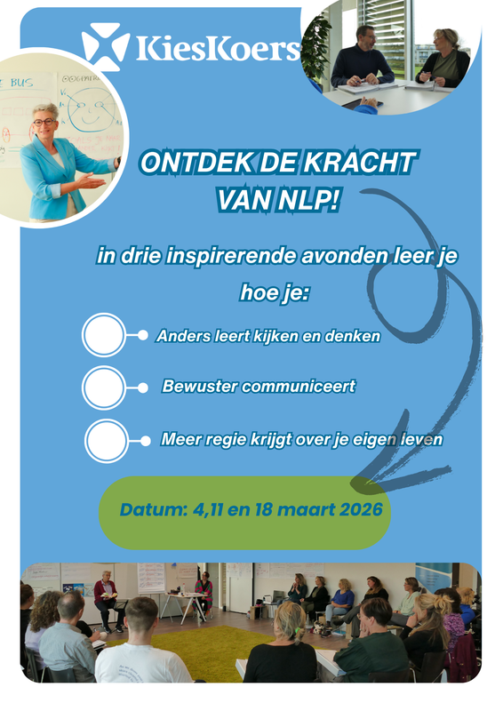 Laat je inspireren door de kracht van NLP! KiesKoers neemt je in drie avonden mee in nieuwe manieren van waarnemen, communiceren en richting geven aan je eigen leven.